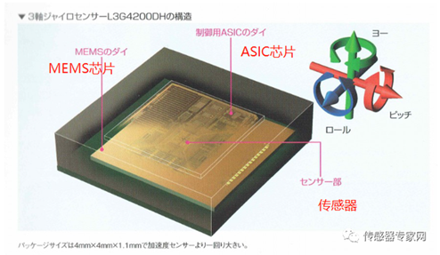 下图是一颗封装好的3轴MEMS陀螺仪,ASIC芯片位于MEMS芯片上方,整个器件尺寸为4mm*4mm*1.1mm。