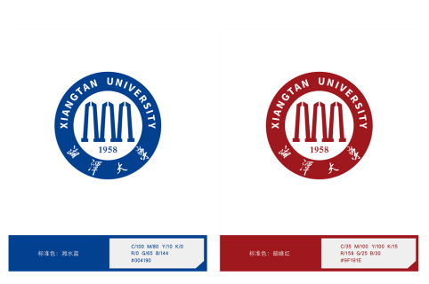 湘潭大学校徽有“韶峰红”和“湘水蓝”两套标准色,总体设计简约而不简单。“韶峰红”与“湘水蓝”来自校歌“韶峰高,湘水长”。“韶峰红”取自伟人故里韶山,是主席铜像广场上飘扬的红旗与巍巍韶峰交映的颜色,彰显着湘大人坚定勇敢与自强不息。“湘水蓝”取自湖南的母亲河湘江,清晨的湘江静谧悠长,默默地守护着三湘大地,寓意着湘大守护着万千学子成长成才。