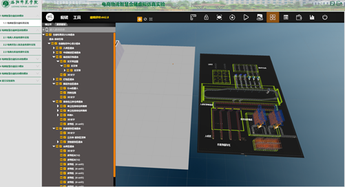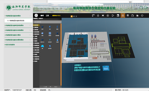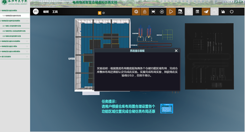 操作步骤二:等待实验自动加载,查看任务提示,明确实验目标将仓库布局图合理设置,完成各个仓储库区布局。