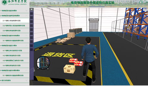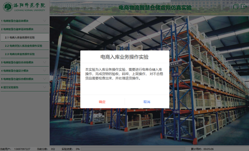 操作步骤一:选择软件左侧 2【电商智慧仓储总体模块】,点击【电商智慧仓储布局实验】,仔细观察弹出的实验介绍,了解需要完成的实验内容。阅读完毕后点击【确定】进入本实验。