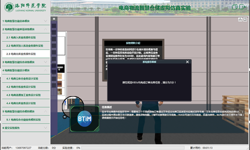 操作步骤一:点击软件左上方 2【电商智慧仓储总体模块】,选择【电商出库业务操作实验】,了解实验内容后进入本实验。在实验场景中,查看实验的评分规则,及该实验需要完成的相关操作步骤。