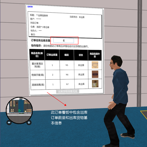 操作步骤二:查看出库任务信息,了解出库货物总量,各出库货物的品类与装车点。点击墙上红色按钮,正式开始操作实验。