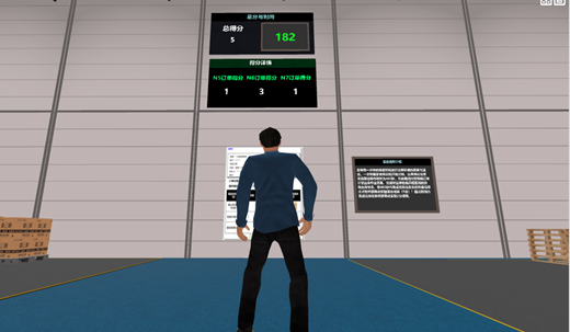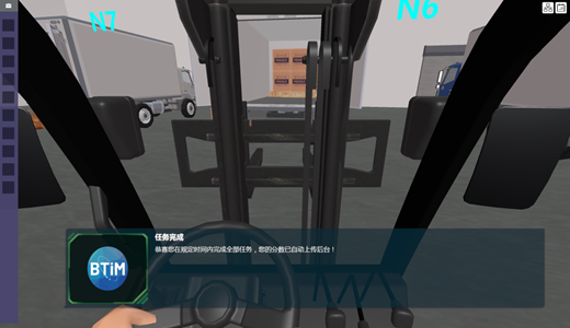 操作步骤三:驾驶叉车,按照制定的出库计划进行出库操作。运送过程中请注意叉车速度,避免货物侧翻。C健可切换驾驶叉车视角,WASD可进行叉车前进、后退与转向,空格可使叉车暂停。M/N进行货叉提升与下降。货物全部出库后,将出现实验完成提示。