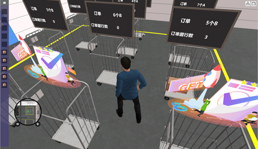 操作步骤四:前往订单出库作业区查看出库订单,根据订单提示看板上的货物需求从存储区拣选相应的货物放置在对应的物流台车中,待订单完成提示弹出后代表该订单完成。完成所有订单后将以出库效率给出实验分数。