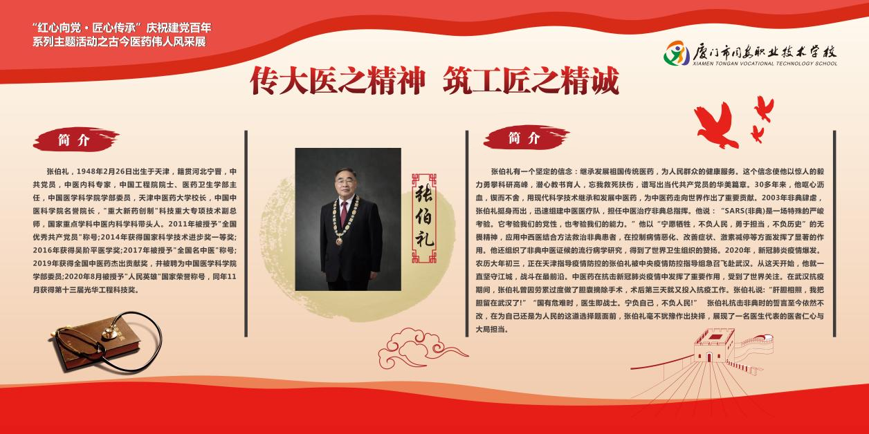 张伯礼有一个坚定的信念:继承发展祖国传统医药,为人民群众的健康服务。这个信念使他以惊人的毅力勇攀科研高峰,潜心教书育人,忘我救死扶伤,谱写出当代共产党员的华美篇章。30多年来,他呕心沥血,锲而不舍,用现代科学技术继承和发展中医药,为中医药走向世界作出了重要贡献。2003年非典肆虐,张伯礼挺身而出,迅速组建中医医疗队,担任中医治疗非典总指挥。他说:“SARS(非典)是一场特殊的严峻考验。它考验我们的党性,也考验我们的能力。”他以“宁愿牺牲,不负人民,勇于担当,不负历史”的无畏精神,应用中西医结合方法救治非典患者,在控制病情恶化、改善症状、激素减停等方面发挥了显著的作用。他还组织了非典中医证候的流行病学研究,得到了世界卫生组织的赞扬。