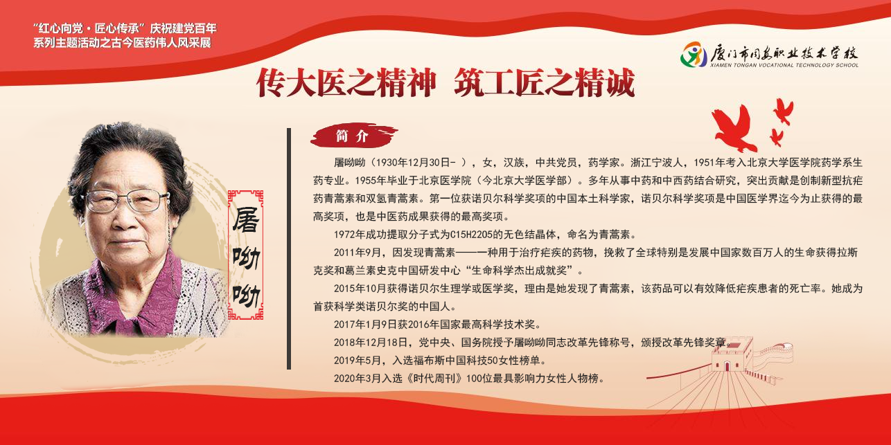 屠呦呦(1930年12月30日- ),女,汉族,中共党员,药学家。浙江宁波人,1951年考入北京大学医学院药学系生药专业。1955年毕业于北京医学院(今北京大学医学部)。多年从事中药和中西药结合研究,突出贡献是创制新型抗疟药青蒿素和双氢青蒿素。第一位获诺贝尔科学奖项的中国本土科学家,诺贝尔科学奖项是中国医学界迄今为止获得的最高奖项,也是中医药成果获得的最高奖项。