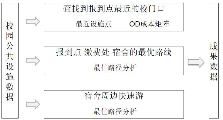 本实验以地质与测绘学院新生报到面临的“路线规划”为应用场景,围绕“到报到点最近的校门口、报到点-缴费处-宿舍的最优路线、宿舍周边快速游的路径规划”3个问题,基于校园路网及设施等空间数据,完成路径规划问题。