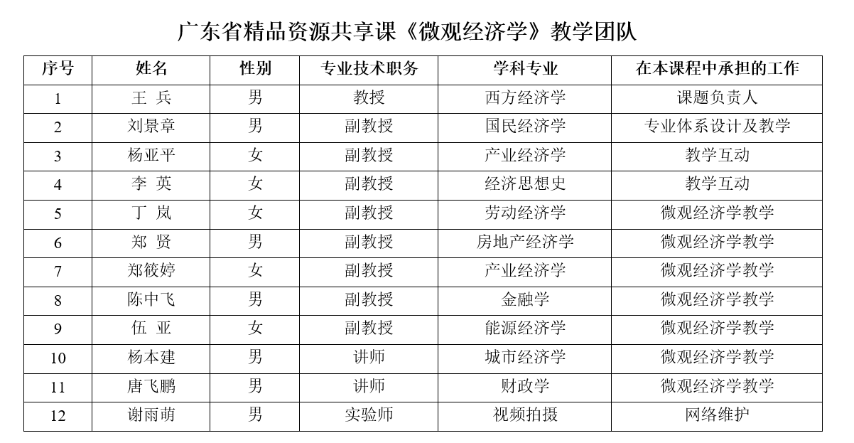 经过近五年的课程建设,教学团队的整体结构进一步优化。目前微观经济学课程已建成一支职称和年龄结构合理、学历层次高、学缘结构优化、教学经验丰富、科研能力突出的教学团队。目前团队共有主讲教师11名,分别毕业于香港大学、中国人民大学、武汉大学、厦门大学、中山大学等名校。此外,课程团队还配有年轻助教和研究生负责课程的辅导答疑、实践实习等工作,并有1 位专业技术人员负责课程的网络建设,这些都能保证课程教学任务的完成以及今后的长期动态建设。