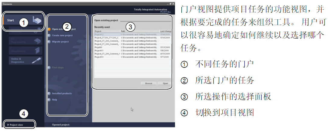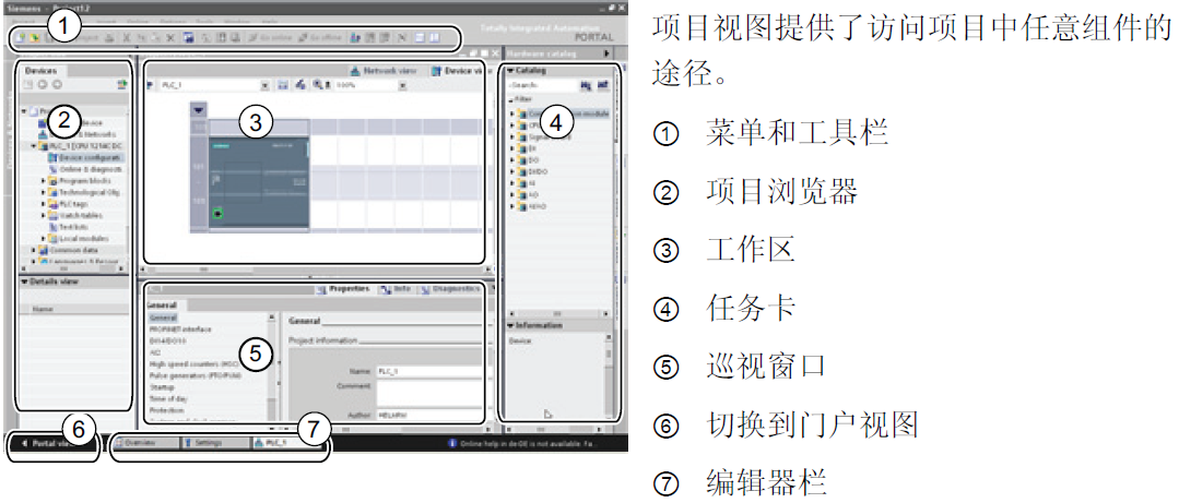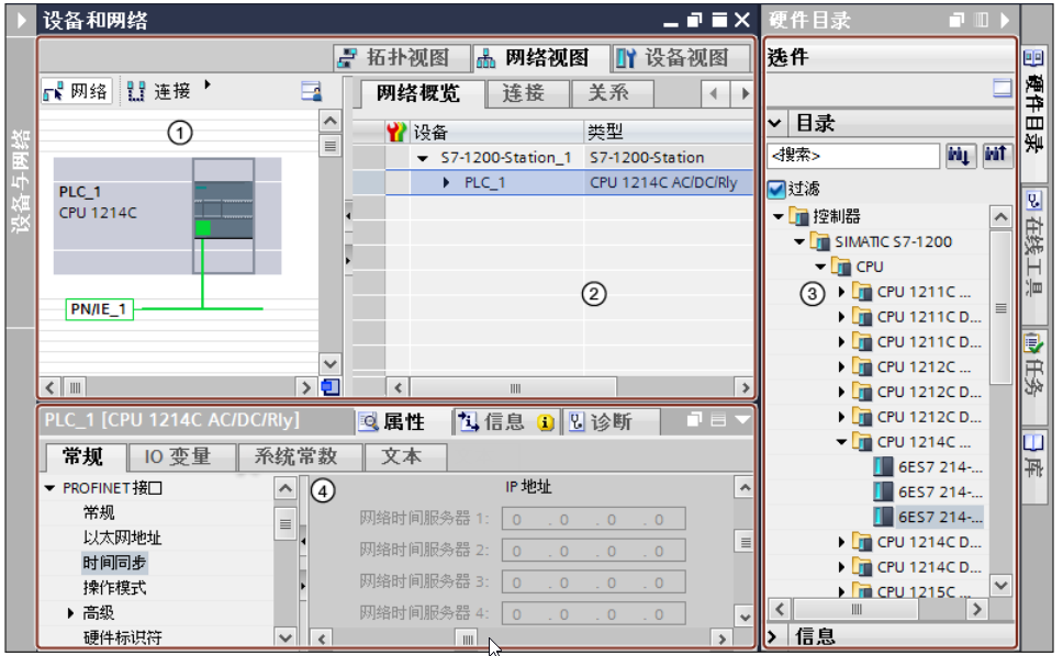 ① 设备视图、网络视图、拓扑视图:图形区域 ② 设备视图、网络视图、拓扑视图:表格区域 ③ 硬件目录 ④ 巡视窗口