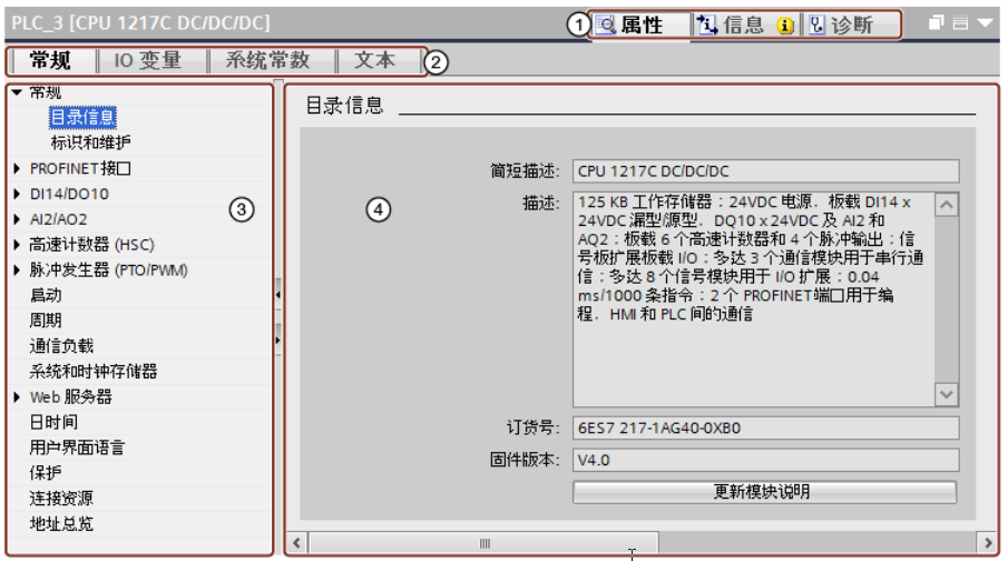 “常规”(General) 选项卡 显示设备或模块的属性和设置。在此处可编辑设置和参数。巡视窗口的左窗格用于区域导航。信息和参数分组安排在此处。单击组名称左侧的箭头符号可以展开该组,前提是它有子组。如果选择一个组或子组,则相应的信息和参数将在巡视窗口的右窗格中显示,并且也可在此对其进行编辑。