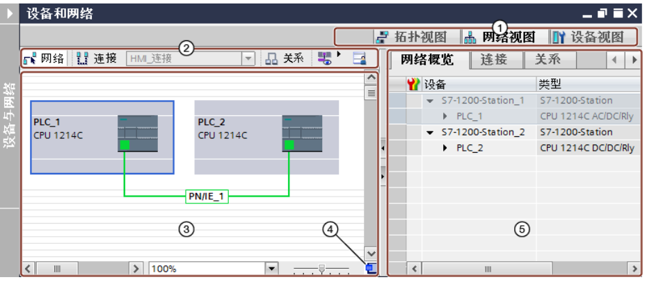 网络视图是硬件和网络编辑器的三个工作区中的一个。在此处可执行以下任务:组态和分配设备参数,设备间组网和编辑设备名称