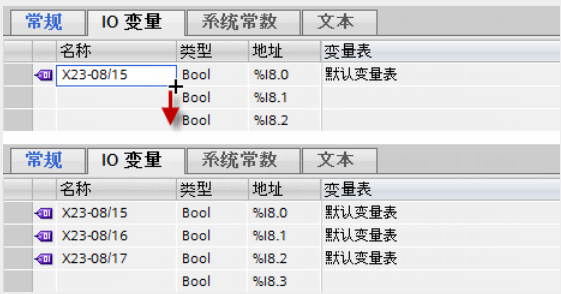 单击该表格中的变量符号,并将其拖放到其它编辑器中。例如,可将变量分配给程序编辑器中的一个指令,或将变量复制到其它设备的变量表中。也可以使用自动填充功能