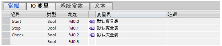 “IO 变量”(IO tags) 选项卡显示设备、PLC 和各模块的 IO 变量。用户可以分配变量的名称,通过下拉列表将变量分配给用户定义的变量表,以及输入变量注释。IO 变量也显示在 PLC 变量表中。