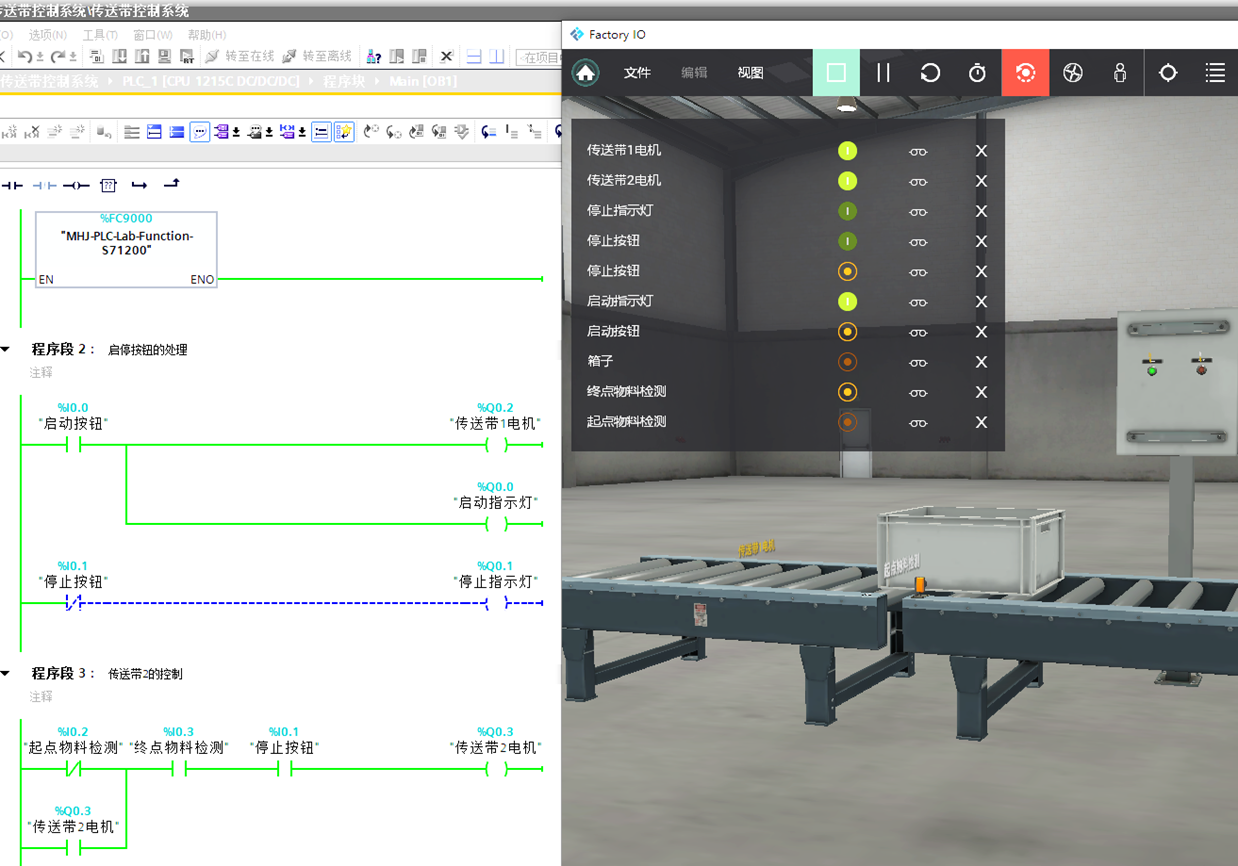 本次任务主要目的是认识Factory IO。先打开Factory IO场景库中的一个传送带系统场景,如图7‑1所示。然后,在TIA Portal中编写西门子S7-1200/1500 PLC的程序,用S7-1200/1500 PLC实物(或者PLCSIM软件)来控制Factory IO中的传送带系统。具体要求如下: