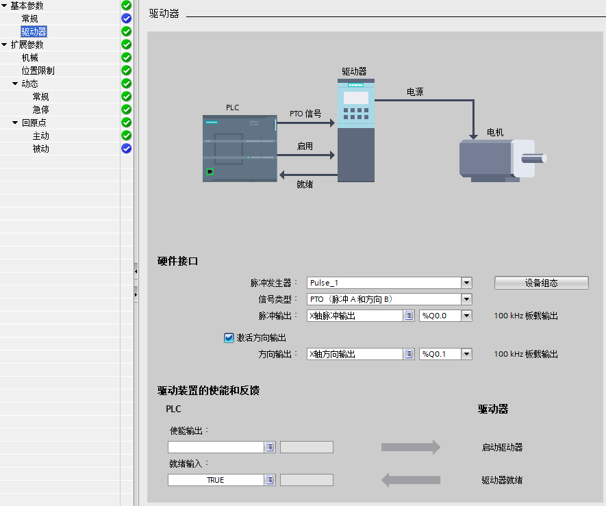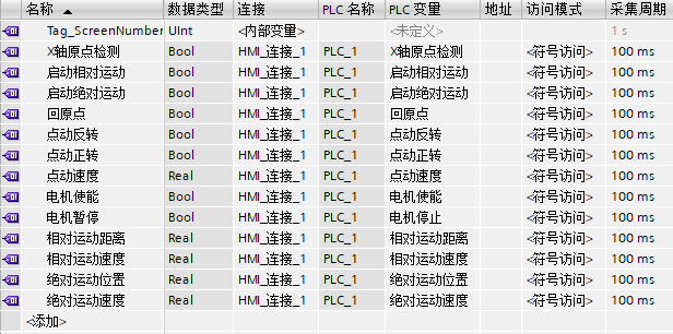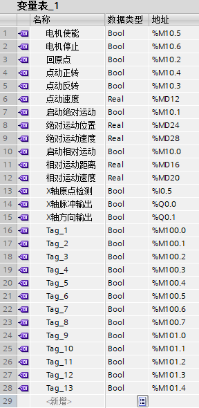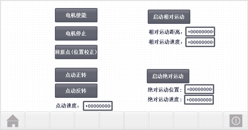 用PLC实现对步进电机的点动控制、相对运动控制和绝对运动控制。在触摸屏上设置电机使能、电机停止、回原点(位置校正)、点动正转、点动反转、启动相对运动、启动绝对运动等7个按钮,并设置点动速度、相对运动距离、相对运动速度、绝对运动位置、绝对运动速度等5个数值输入框。