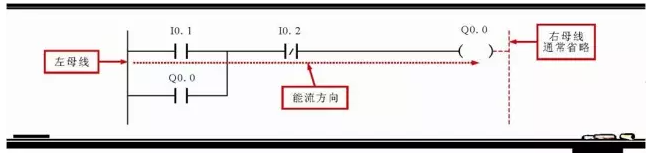 一般情况下,西门子PLC梯形图编程时,习惯性的只画出左母线,省略右侧母线,但其所表达梯形图程序中的能流仍是由左母线经程序中触点I0.1、I0.2、线圈Q0.0等至右母线中的过程。