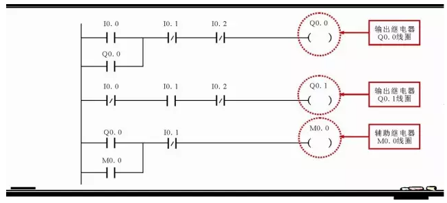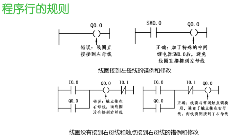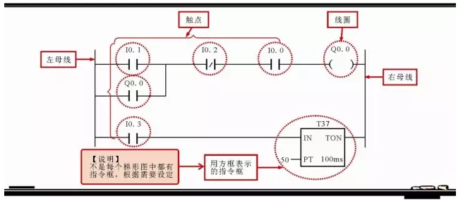 梯形图按自上而下,从左向右的顺序排列。每一逻辑行总是起于左母线,经触点的连接,然后终止于线圈输出或指令框,触点不能放在线圈的右边。