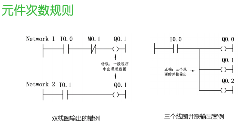 元件次数规则:在梯形图中,应控制每个逻辑线圈(或其他执行元件)的使用次数,避免过度使用或滥用元件,以保持程序的简洁性和高效性。同时,应合理地利用元件,避免浪费和冗余。
