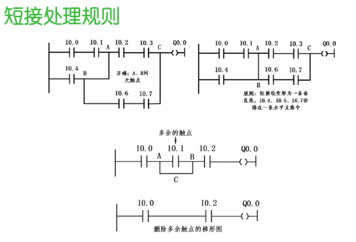 短接处理规则:在梯形图中,短接是指两个或多个逻辑线路在同一垂直线上交叉连接,这种情况会导致程序执行时的不确定性和错误。因此,应该避免在梯形图中出现短接,确保逻辑线路的清晰和正确连接。