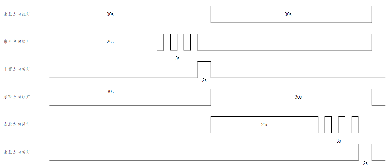 首先南北方向红灯亮、东西方向绿灯亮,南北方向红灯亮维持30s,在此期间东西方向绿灯亮维持25s,25s后东西方向绿灯闪烁,闪烁3s后熄灭。