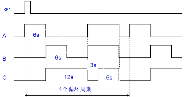 1、早上8点按下启动按钮SB1,A、B、C三组喷头按照图2所示的时序图循环工作15 h,到晚上11点时自动停止。9 h后,即第二天早上8点,花式喷泉又自动开始按照图2所示的时序图循环工作15 h,即再到晚上11点又自动停止工作。每天都按照上述时间不断循环工作。