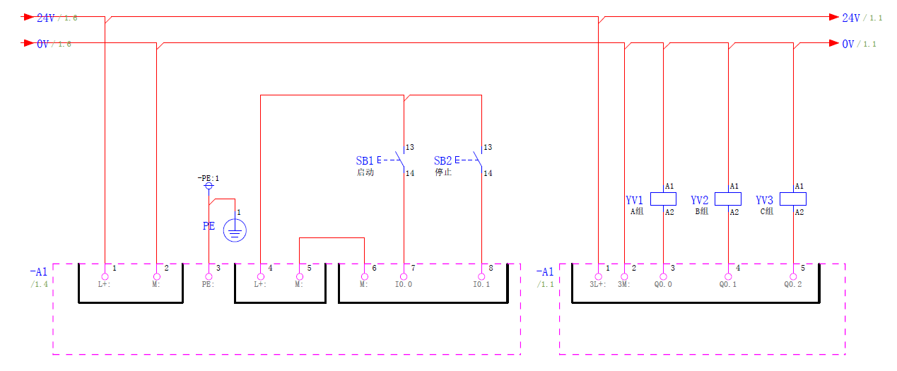 安装接线时,为了最大程序保护电路,控制喷头喷水的电磁阀YV1、YV2、YV3暂时先不要接到S7-1200的输出端,等待梯形图调试通过后再接线,如下图所示。