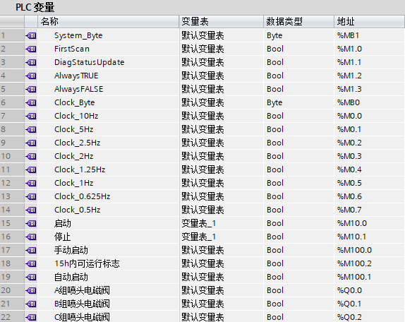 本任务是1个长时限的带延时的顺序控制(工作时间为早8点到晚11点,共15 h;3组喷头按一定的顺序延时工作)。选用S7-1200为控制器,PLC有3种(1 ms、10 ms、100 ms)定时时基,最长定时时间为3276.7 s,无法实现本任务时限要求,因此,需要采用“计数器+定时器”的接力定时,组合实现长时间的延时控制。除此之外,3组喷头按照一定的时序顺序工作,可以选用比较指令,也可以使用几个定时器组成顺序脉冲发生器。因此,采用经验设计法编程,本任务需要综合运用位逻辑指令、比较指令、定时器指令及计数器指令。