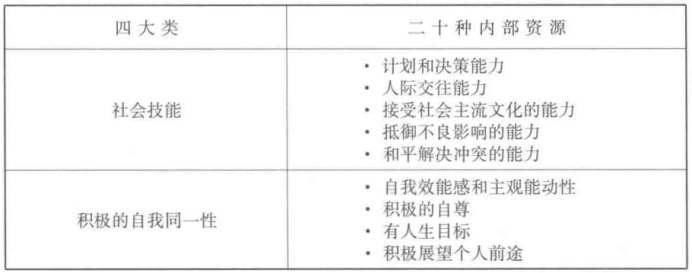 彼得·本森(Peter Benson,2006)的发展资源模型是将生态环境特征(外部资源)与个人品质(内部资源)关联起来的理论模型。该模型认为,外部资源与内部资源就像一些动态互连的“积木”,共同防御高风险行为的发生,促进多种形式的积极发展。该模型一共列出了四大类二十种内部资源,具体内容详见表7一2。
