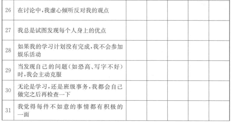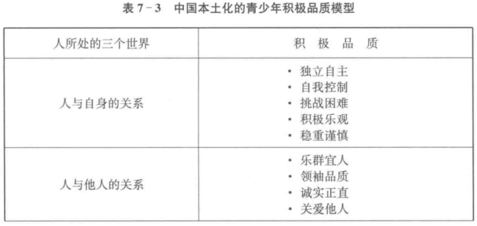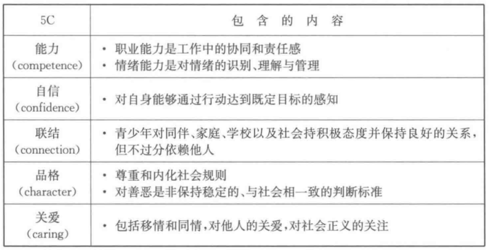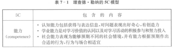 心理学家理查德·勒纳等在“青少年积极发展的4-H研究”的背景下,提出青少年的积极发展包含五个方面的成分,由于五个成分的英文名字都以首字母C开头,所以被称为5C模型。五个成分包含的内容详见表7一1。