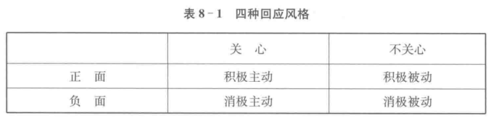 我们在与他人进行人际互动的过程中,可以有不同的回应方式。当别人与我们分享一件好事的时候,我们可以有关心和不关心的回应态度以及正面和负面的回应内容。如此一来,在人际交往过程中,不同的回应态度与回应内容的组合会形成如表8-1所示的四种回应风格。