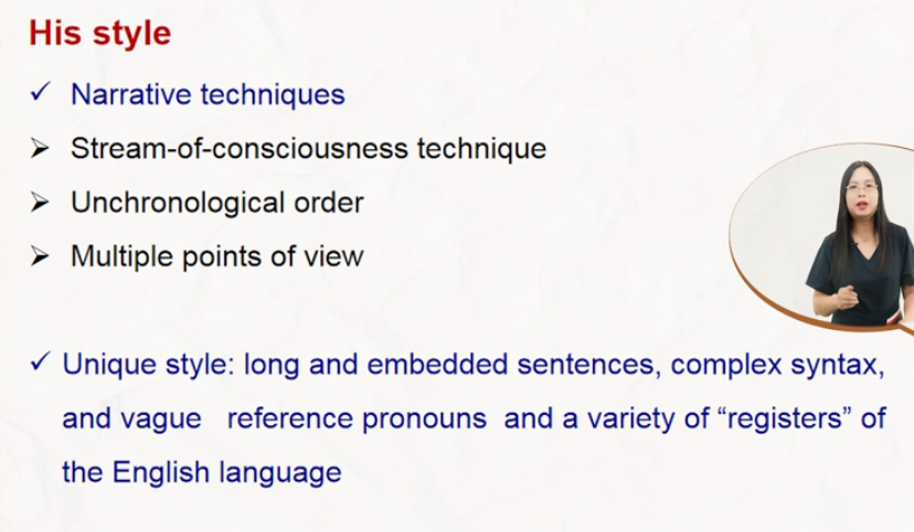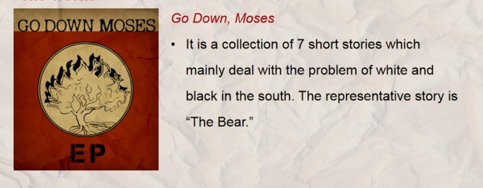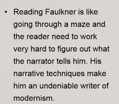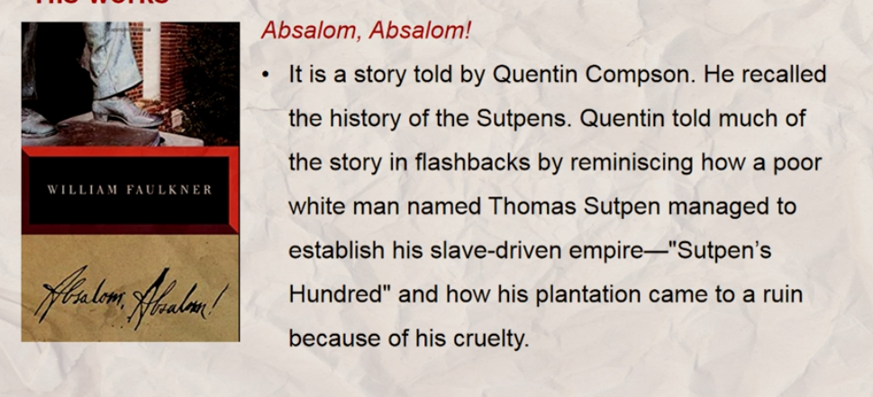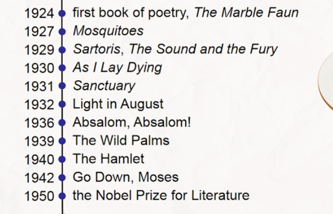William Faulkner (1897-1962), who came from an old southern family, grew up in Oxford, Mississippi. He joined the Canadian, and later the British, Royal Air Force during the First World War, studied for a while at the University of Mississippi, and temporarily worked for a New York bookstore and a New Orleans newspaper. Except for some trips to Europe and Asia, and a few brief stays in Hollywood as a scriptwriter, he worked on his novels and short stories on a farm in Oxford.