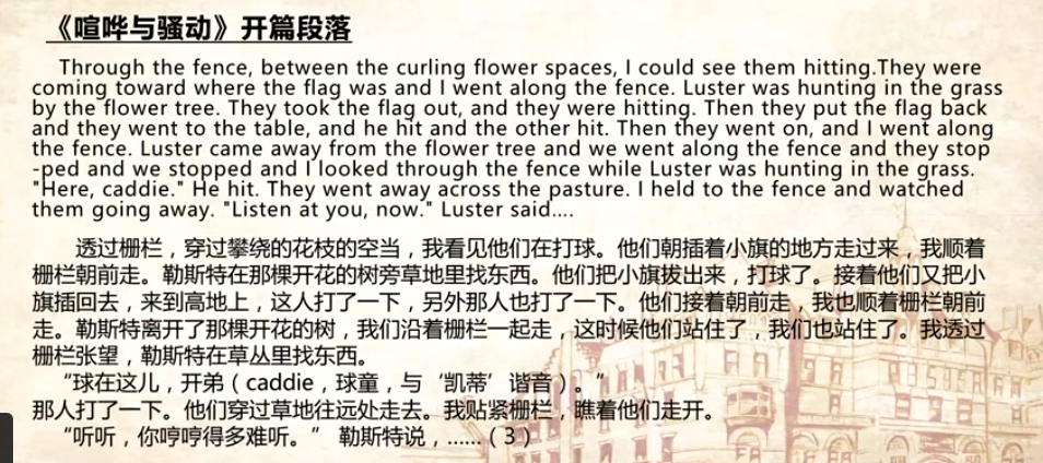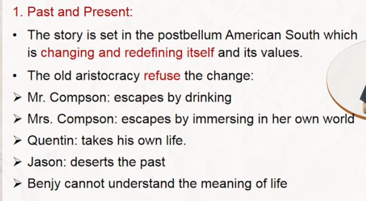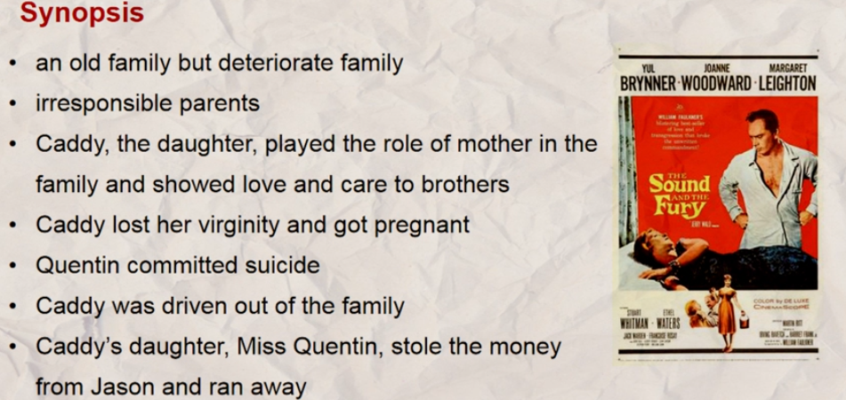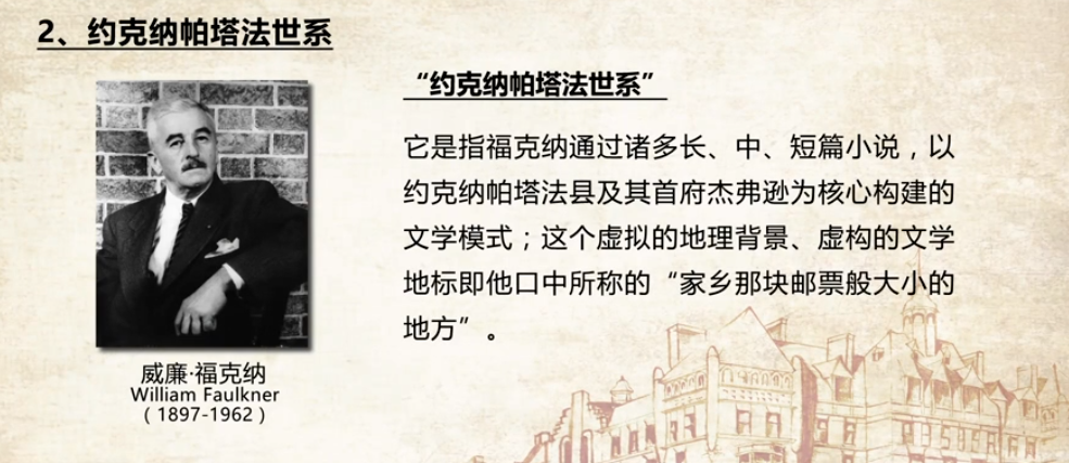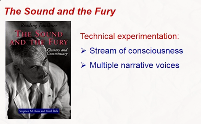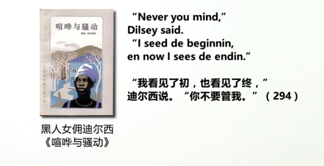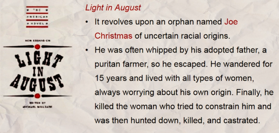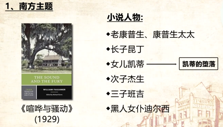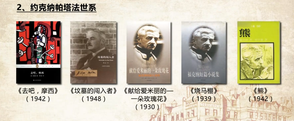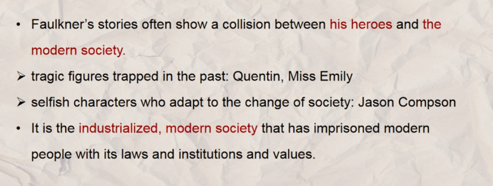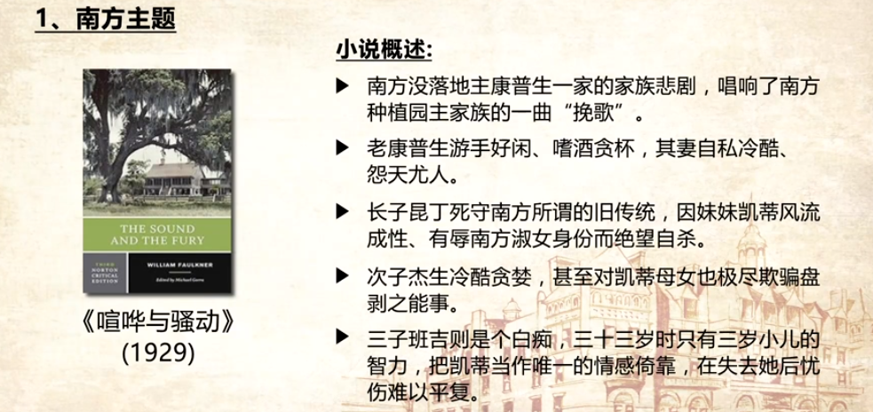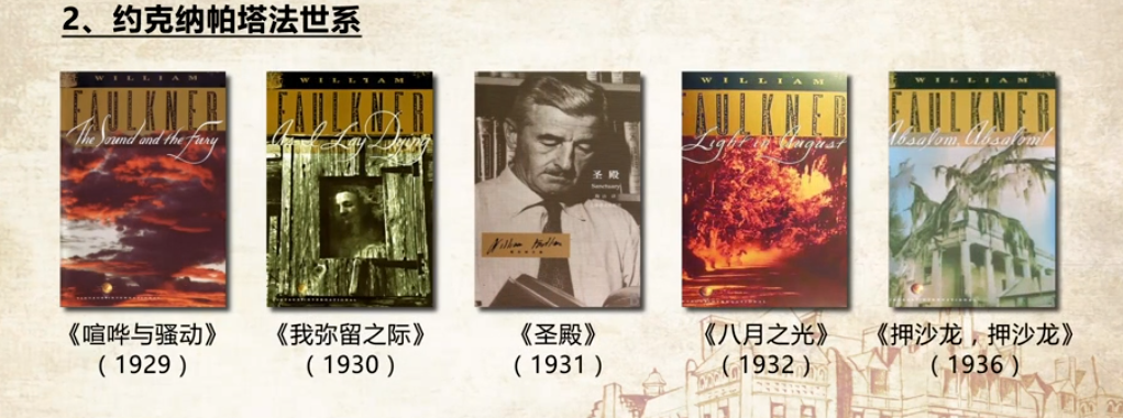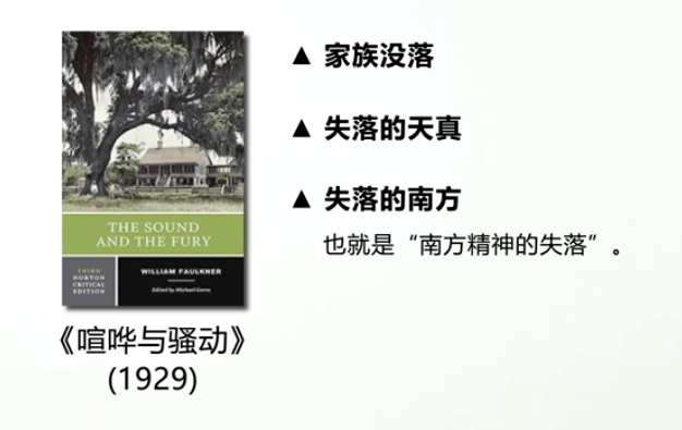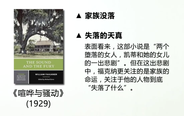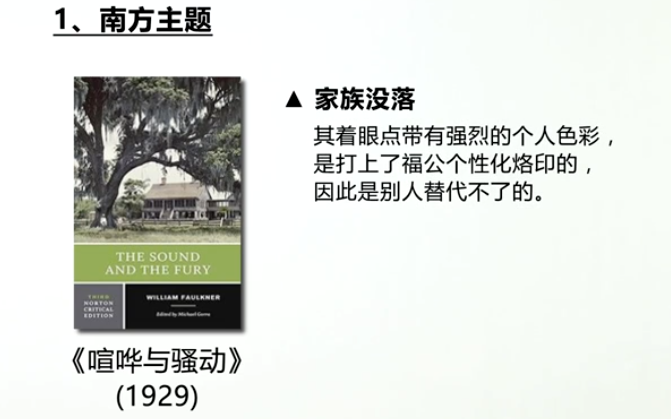 In an attempt to create a saga of his own, Faulkner has invented a host of characters typical of the historical growth and subsequent decadence of the South. The human drama in Faulkner's novels is then built on the model of the actual, historical drama extending over almost a century and a half Each story and each novel contributes to the construction of a whole, which is the imaginary Yoknapatawpha County and its inhabitants. Their theme is the decay of the old South, as represented by the Sartoris and Compson families, and the emergence of ruthless and brash newcomers, the Snopeses. Theme and technique – the distortion of time through the use of the inner monologue are fused particularly successfully in The Sound and the Fury (《喧哗与骚动》) (1929), the downfall of the Compson family seen through the minds of several characters. The novel Sanctuary (1931) is about the degeneration of Temple Drake, a young girl from a distinguished southern family. Its sequel, Requiem For A Nun (1951), written partly as a drama, centered on the courtroom trial of a Negro woman who had once been a party to Temple Drake's debauchery. In Light in August (1932), prejudice is shown to be most destructive when it is internalized, as in Joe Christmas, who believes, though there is no proof of it, that one of his parents was a Negro. The theme of racial prejudice is brought up again in Absalom, Absalom! (1936), in which a young man is rejected by his father and brother because of his mixed blood. Faulkner's most outspoken moral evaluation of the relationship and the problems between Negroes and whites is to be found in Intruder In the Dust (1948).