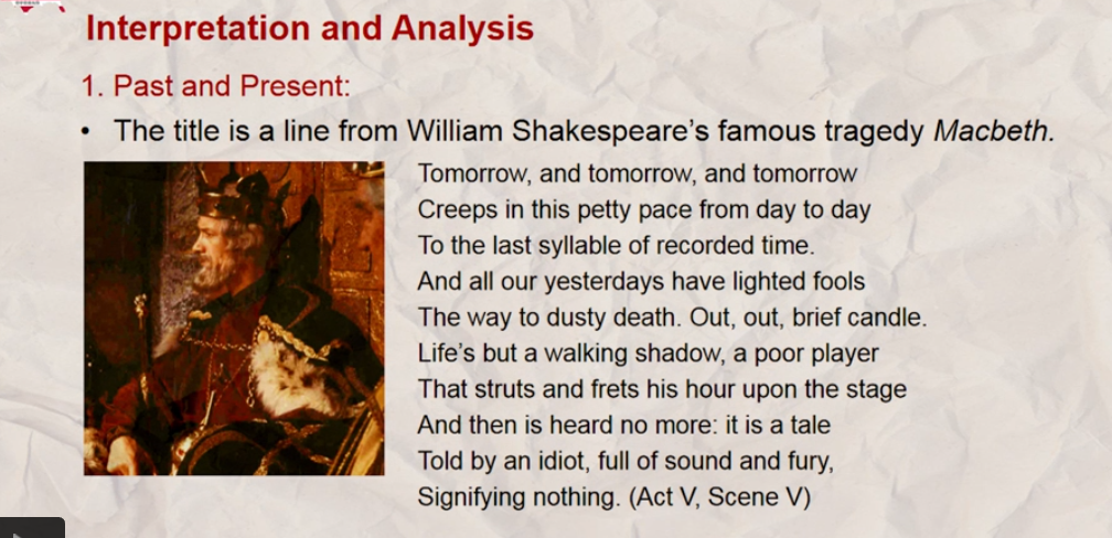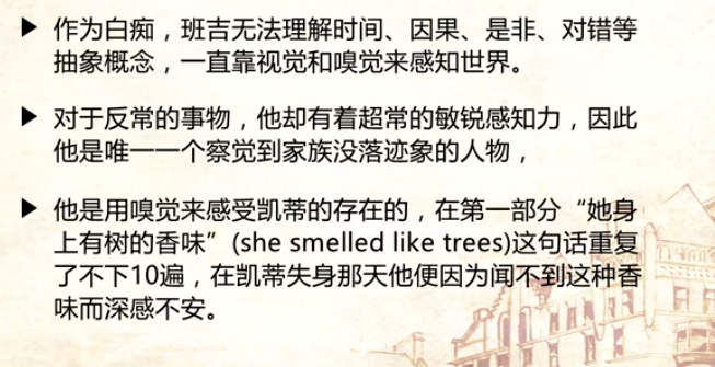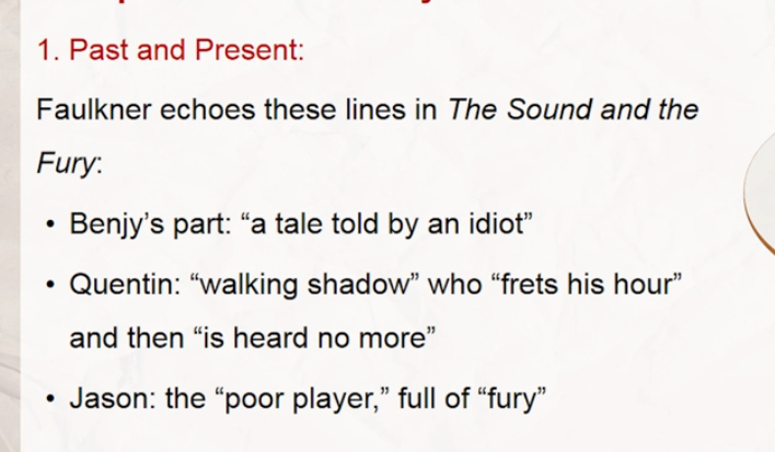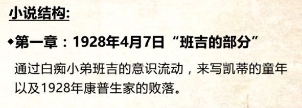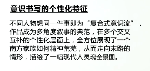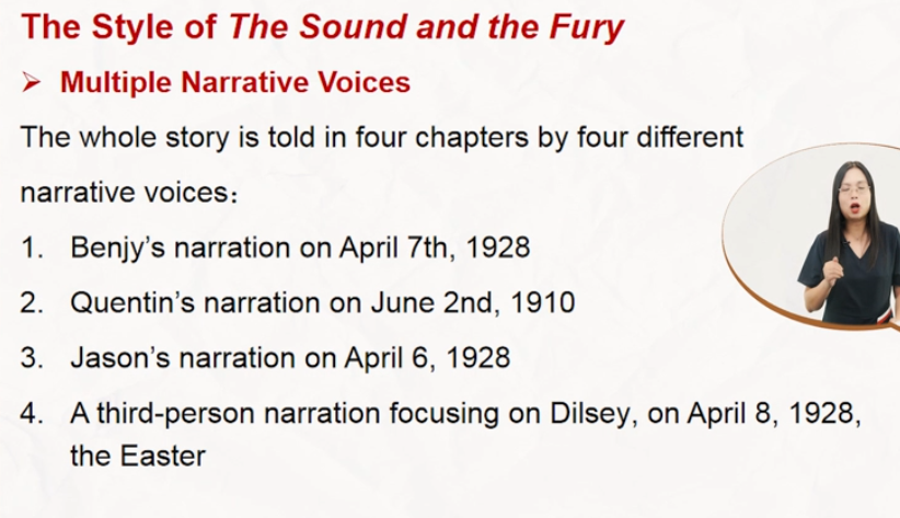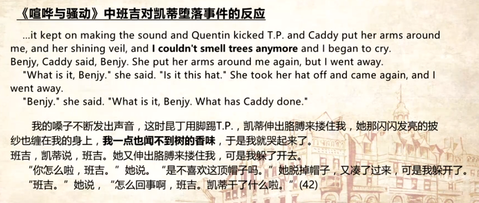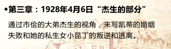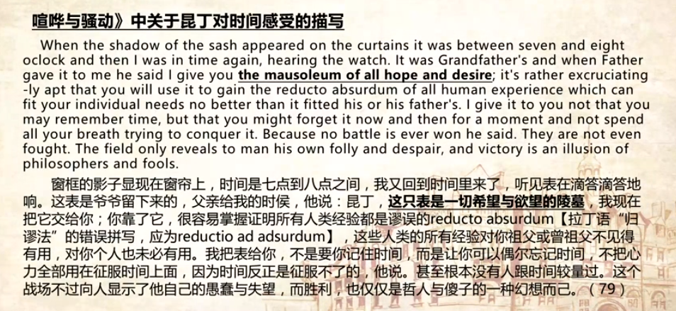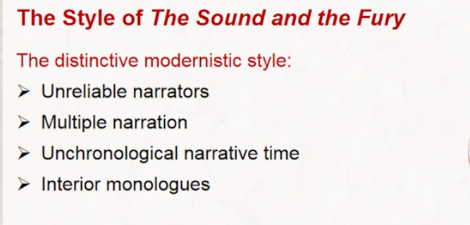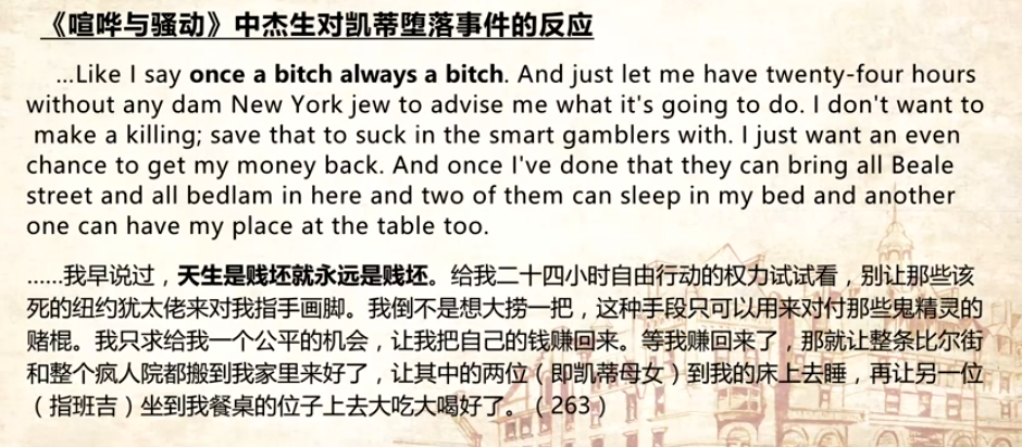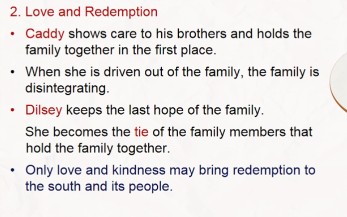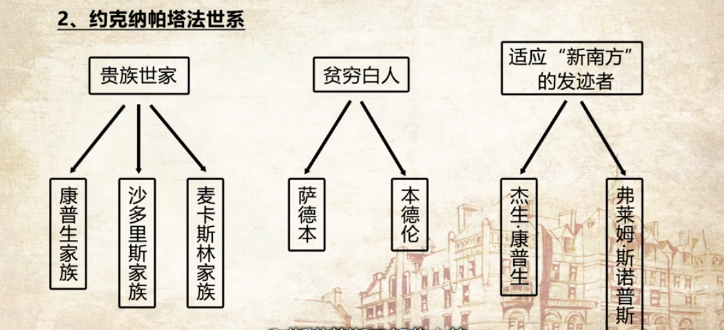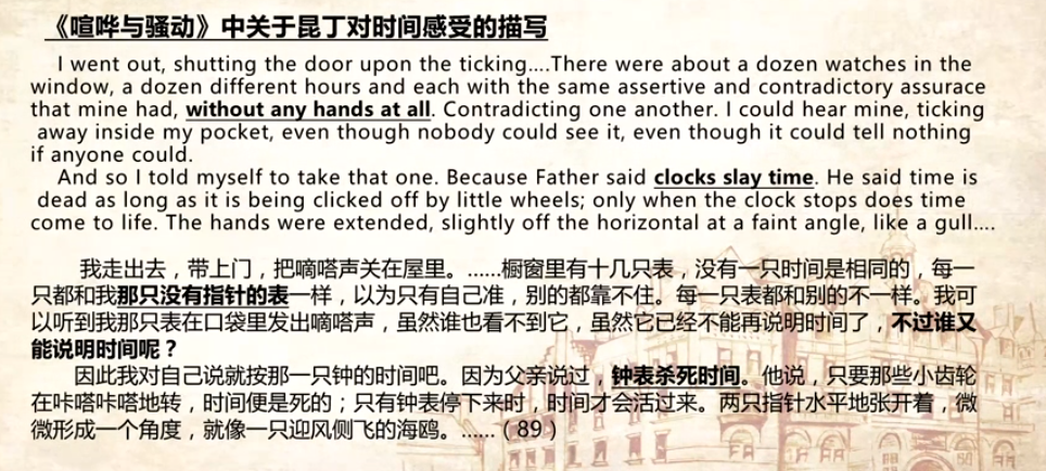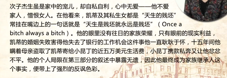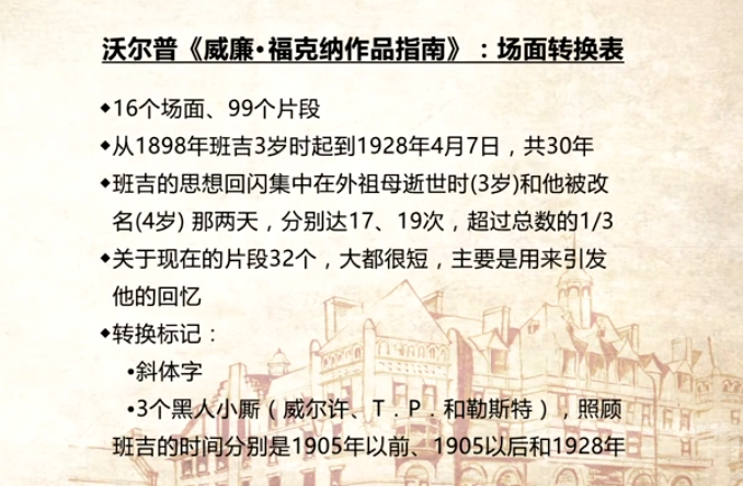 In an attempt to create a saga of his own, Faulkner has invented a host of characters typical of the historical growth and subsequent decadence of the South. The human drama in Faulkner's novels is then built on the model of the actual, historical drama extending over almost a century and a half Each story and each novel contributes to the construction of a whole, which is the imaginary Yoknapatawpha County and its inhabitants. Their theme is the decay of the old South, as represented by the Sartoris and Compson families, and the emergence of ruthless and brash newcomers, the Snopeses. Theme and technique – the distortion of time through the use of the inner monologue are fused particularly successfully in The Sound and the Fury (《喧哗与骚动》) (1929), the downfall of the Compson family seen through the minds of several characters. The novel Sanctuary (1931) is about the degeneration of Temple Drake, a young girl from a distinguished southern family. Its sequel, Requiem For A Nun (1951), written partly as a drama, centered on the courtroom trial of a Negro woman who had once been a party to Temple Drake's debauchery. In Light in August (1932), prejudice is shown to be most destructive when it is internalized, as in Joe Christmas, who believes, though there is no proof of it, that one of his parents was a Negro. The theme of racial prejudice is brought up again in Absalom, Absalom! (1936), in which a young man is rejected by his father and brother because of his mixed blood. Faulkner's most outspoken moral evaluation of the relationship and the problems between Negroes and whites is to be found in Intruder In the Dust (1948).
