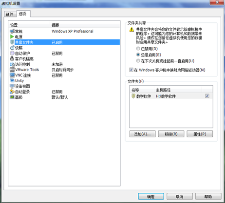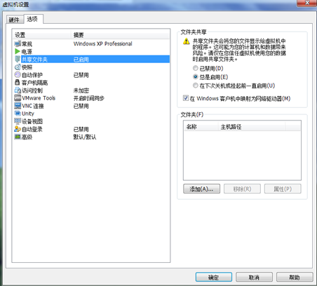 “虚拟机”/设置,选择“选项”选项卡,单击“共享文件夹”,右侧勾选“总是启用”,复选框打钩,并单击下方的 “添加”按钮