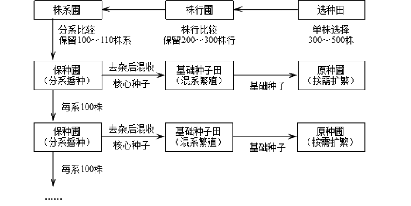 只经过单株(穗)选择、株(穗)行圃和原种圃,株行圃不单收单脱,而是严格去杂去劣,当选株行混合收获脱粒,直接种于原种圃生产原种。