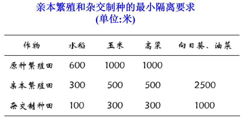 要求在亲本繁殖和杂交制种区周围一定距离内,不种植非父本品种。有的作物如十字花科作物属间也应有一定的隔离。