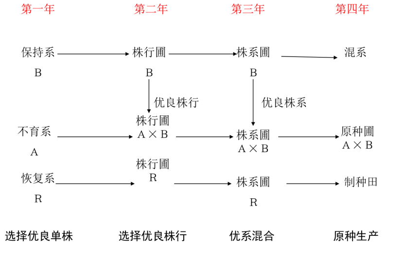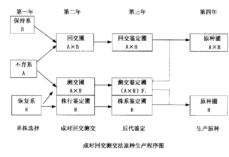 这种方法既注重“三系”亲本的典型性选择,又进行亲本配合力的测定,因此可靠而有效。基本程序是:单株选择、成对回交与测交、后代(株行)鉴定、原种生产。