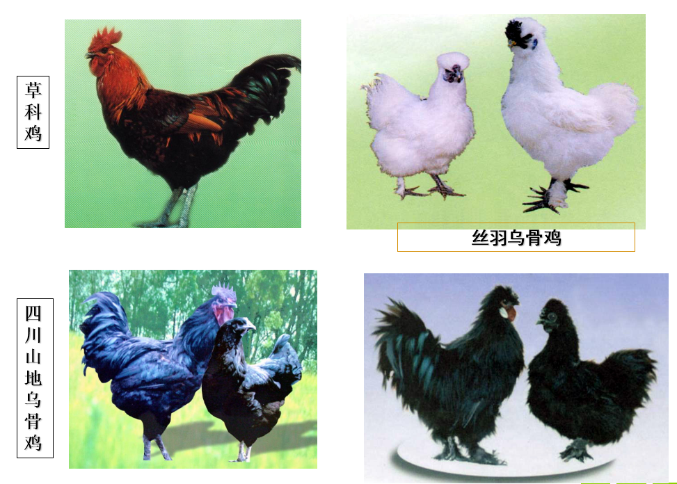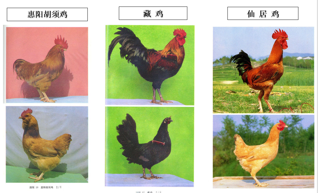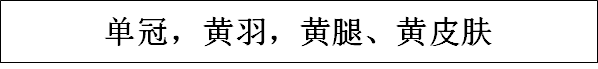按羽色分: 三黄鸡类、麻鸡类、乌鸡类、土鸡类