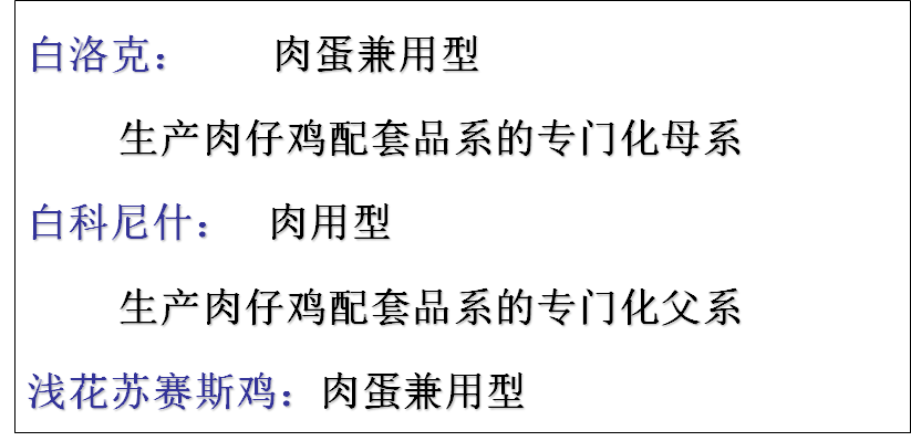 标准品种的肉鸡分为白洛克鸡、白科尼什、浅花苏赛斯鸡三种品种。