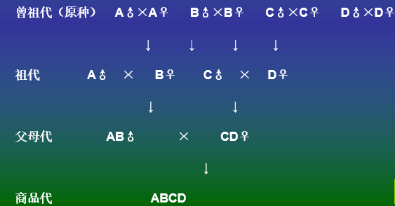 3、四系配套杂交:四系配套杂交的配套系由四个纯系构成,又称双交。先用两个纯系中固定性别的公、母禽分别进行两两杂交,利用其产生的子代再进行杂交,用于生产商品杂交禽。这种杂交方式遗传基础更广,杂交优势也更强,四系配套有利于控制种源和保证供种的连续性,家禽的商品代自别雌雄(羽色和羽速)是采用四系配套产生的,许多育种公司的鸡种都是四系配套形式供种。