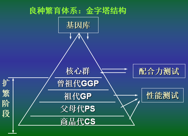 处于金字塔顶的品种场也称基因库,是家禽各种各样基因的保存仓库,其任务是收集、保存、饲养各种家禽品种、品系或群体;研究它们的特征、特性及其遗传规律,发掘可能利用的优良基因,为育种场提供育种素材。