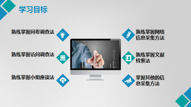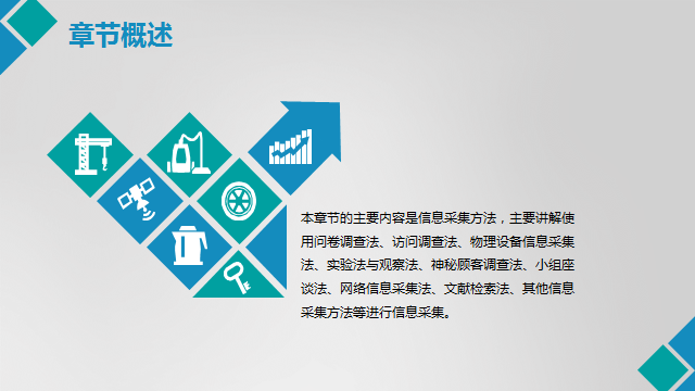 本章节的主要内容是信息采集方法,主要讲解使用问卷调查法、访问调查法、物理设备信息采集法、实验法与观察法、神秘顾客调查法、小组座谈法、网络信息采集法、文献检索法、其他信息采集方法等进行信息采集。