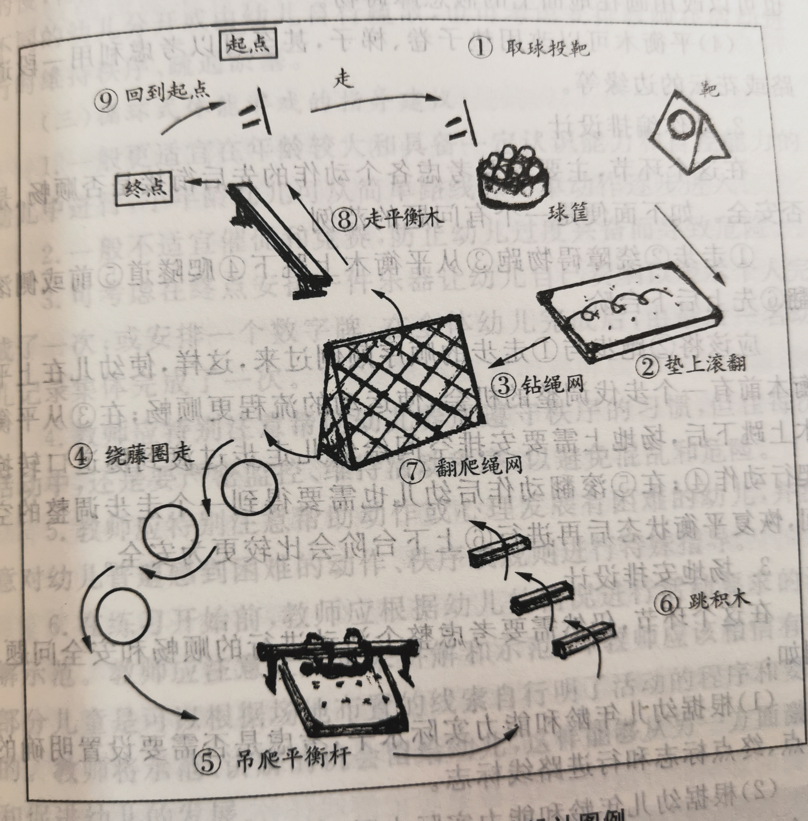 关注幼儿园的晨间锻炼项目设置、户外体育游戏区环境创设、器材投放等,尝试按下图绘制场地示意图,实习返校后课内以报告形式与其他园所同学分享。