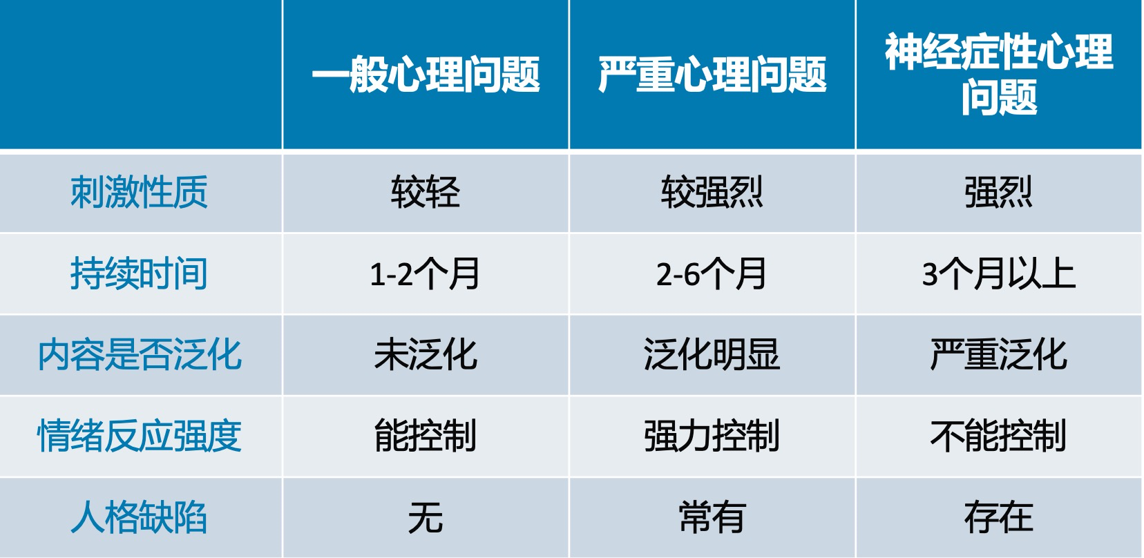 心理异常则是心理活动丧失了以上三个功能,无法保证人的正常生活,随时破坏人的身心健康。心理异常包括神经症、精神分类症以及其他精神病性障碍、心境障碍、人格障碍等。特点有:(1)强烈的心理反应;(2)明显的躯体不适感;(3)损害大;(4)需要心理治疗。