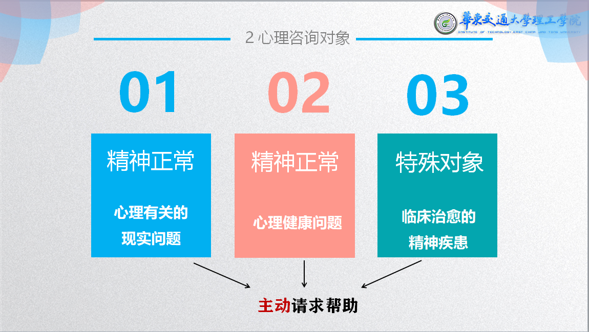 1 精神正常,遇到了与心理有关的现实问题并请求帮助的人群;