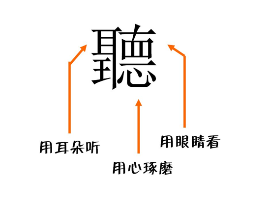 第五层次是同理心的倾听:同理心的倾听的出发点是为了“了解”而非为了“反应”,也就是透过交流去了解别人的观念、感受。同理心的倾听要做到“五到”:不仅要“耳到”,更要“口到”(声调)、“手到”(用肢体表达)、“眼到”(观察肢体动作)、“心到”(用心琢磨)。