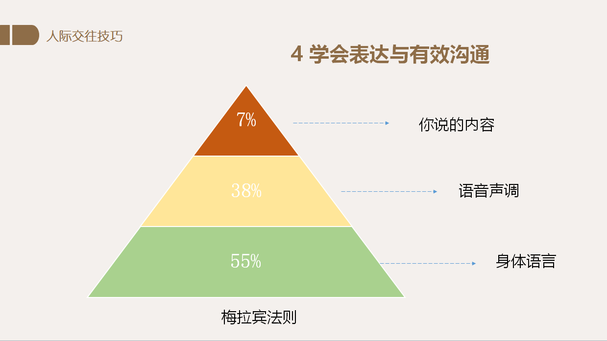 根据沟通专家梅拉宾的研究,人际沟通只有约7%是借助语言来进行的,另外93%是通过非言语信息来进行的,其中38%取决于语音声调,55%依赖于身体语言。