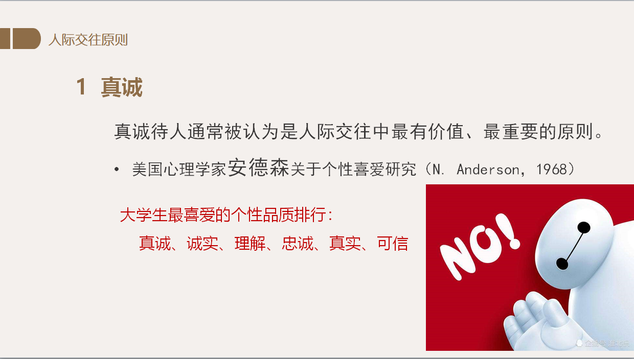 排在序列最前面、喜爱程度最高的六个人格品质是:真诚、诚实、理解、忠诚、真实和可信,它们或多或少、直接或间接都与“真诚”有关;