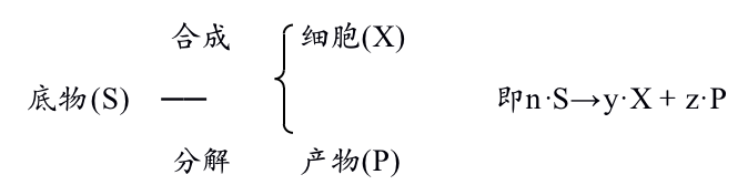 我们可以把化学反应动力学的知识应用到生化反应中。底物在生物的作用下,一部分合成细胞物质,另一部分则分解。如图示:
