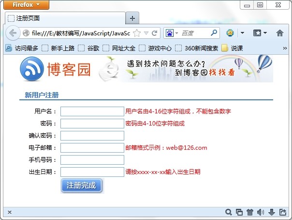 6. 单击注册完成按钮时如果页面信息输入正确则提交表单,否则不提交。